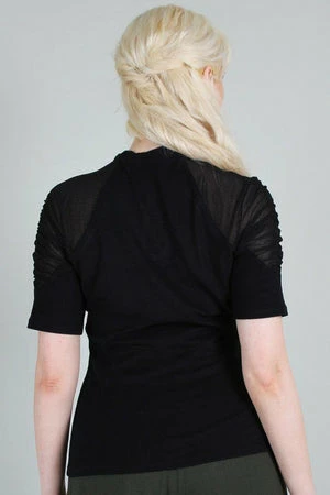 The knitted top has keyhole opening at collar, ruched chiffon polka dot sleeves detailing, short sleeves with cuffs and a flattering fit.