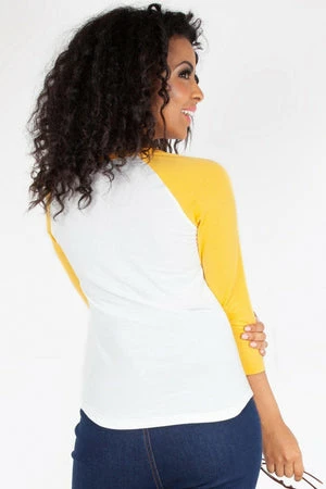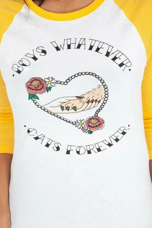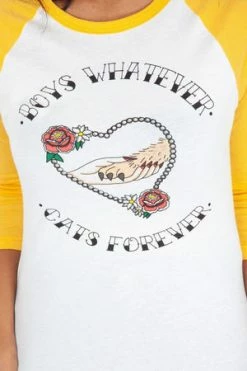 This baseball style, white t-shirt has an exclusively designed tattoo style text print, ‘Boys whatever, cats forever’ caption print, yellow contrast three quarter sleeves and a flattering fit.