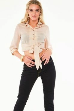 This red jersey blouse has front bow tie detailing, a V-neckline, short sleeve and a flattering fit.