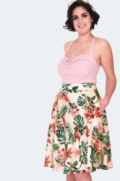 The 50s style sleeveless blouse has cross strap detail, a halter neckline, front button detail and a flattering fit.