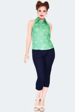 The 60s sleeveless blouse has daisy and polka dot print, high neckline, front button closure and a flattering fit.