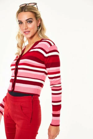 The knitted cardigan has pink and white stripes print, a V-neckline, full length sleeves, rib hem and cuffs and it fastens at the front with glossy buttons.