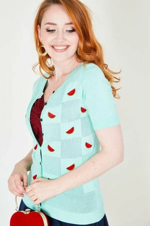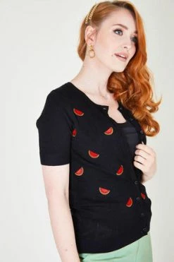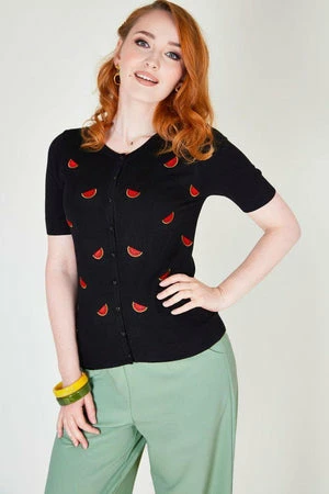 This cardigan has watermelons embroidery, a round neckline, sleeves cut above elbow, rib hem and cuffs and it fastens at the front with contrast buttons.