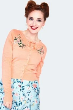 The 50s retro style knitted cardigan has floral embroidery, round neckline, key hole cut out detail, full length sleeves, rib hem and cuffs and it fastens at the front with glossy buttons.