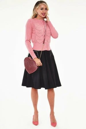 The knitted cardigan has front and back heart stitching detail, a crew neckline, full length sleeves, rib hem and cuffs and it fastens at the front with glossy buttons.