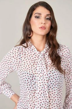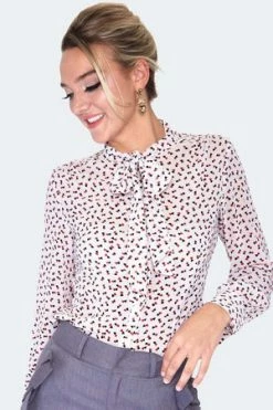 The semi sheer top has all over hearts print, a crew neckline, neck tie detailing, long sleeves and a flattering fit.
