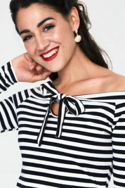 This black top has a striped print, boat neckline, keyhole tie-up detailing, long sleeves and a flattering fit.