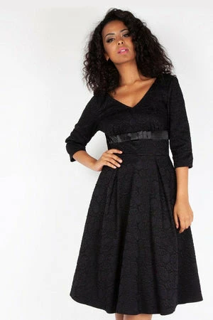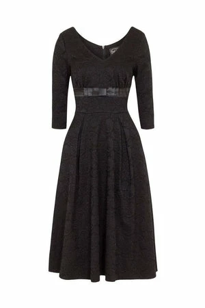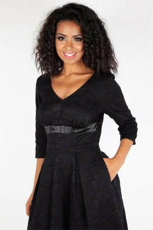 The black dress has paisley print, a V-neckline, elasticated waist, half length sleeves, a flattering fit, tucked bow detail under chest and it fastens with an invisible zipper.