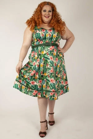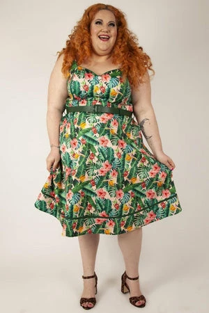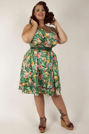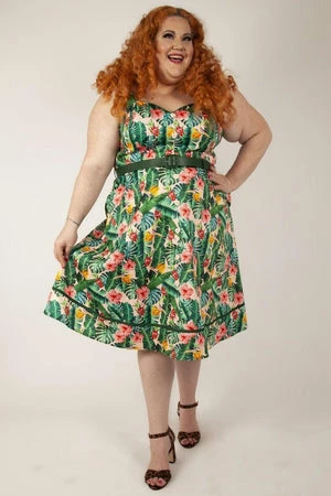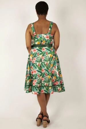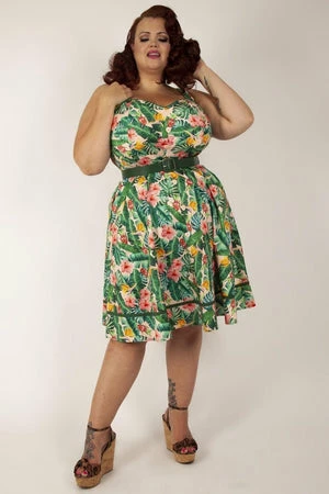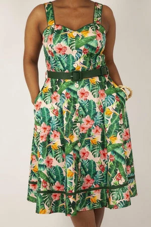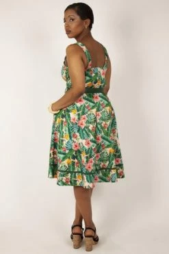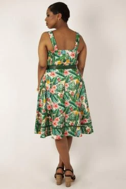 The full circle midi dress has a tropical print, a sweetheart neckline, elasticated side ruching, removable belt detailing, pockets, adjustable straps, a flattering fit and it fastens with a zipper at the back.