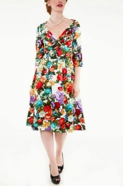 This striking design features a vivid multicolor floral print on a white vintage style dress, the style has matching buttons, a V neckline, mid-arm length sleeves, a flared skirt and a hidden zipper to fasten at the back.
