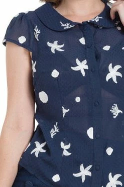 This vintage sheer top has a high neckline with single button clasp, mandarin collar, cap sleeves, side darts and it fastens at the front with buttons.