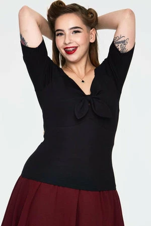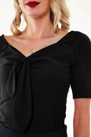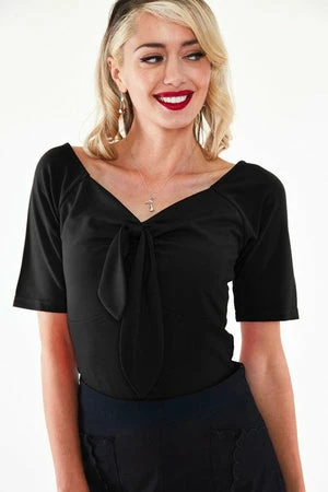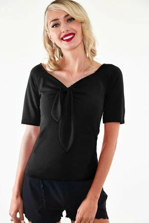 This top pullover has front long tied bow detailing, a V-neckline, short sleeves and a flattering fit.