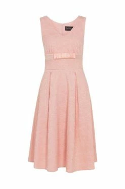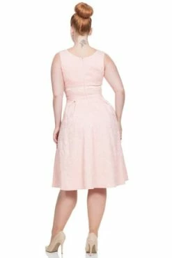 “Lauren”, you will feel like a princess, in this pure and light pink swing style dress from Voodoo Vixen. This design has a floral textured lace material, a V neckline, pleating at the bust, a decorative bow just above the waist and a hidden zip to fasten at the back. A vintage style ideal for fashion wear and also perfect for weddings, available up to plus sizes.