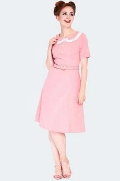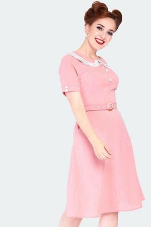 This flared dress has contrast collar, button front detail and pockets, matching belt detail, layered collar, a crew neckline, ribbed hem and cuffs, a flattering fit and it fastens with a zipper at the back.