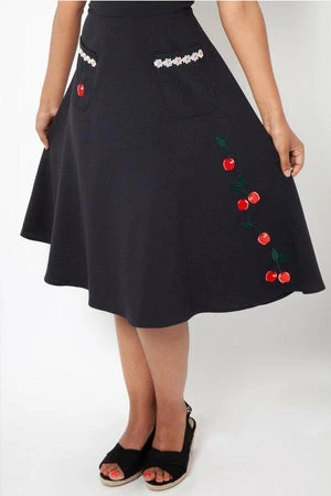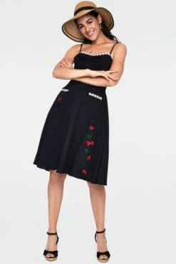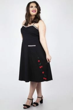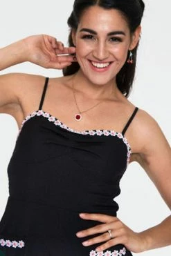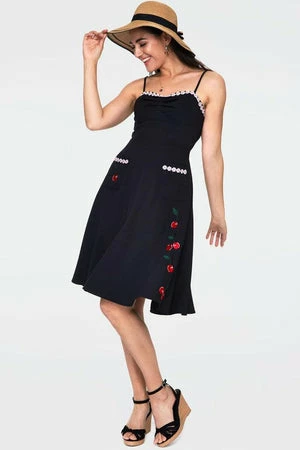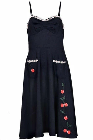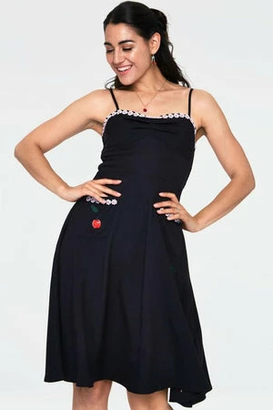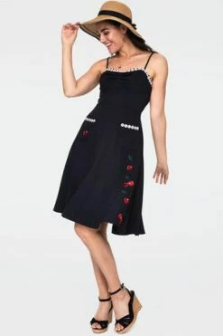 This midi dress has a daisy trim, cherry embroidery, a sweetheart neckline, spaghetti straps, ruched bust detailing, front pockets, a flattering fit and it fastens with a zipper at the back.