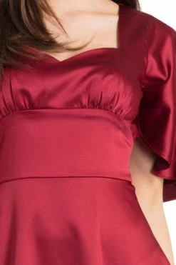 This satin, sleek dress features elbow length bell sleeves, a pleated chest, flared skirt, a sweetheart neckline and A-line shape. The sleeves extend to a cape at the back with a ribbon tie, the dress fastens at the back with an invisible zipper at the back to midway.
