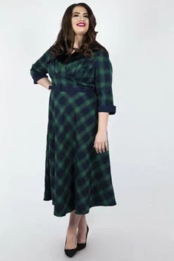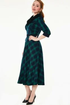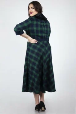 This epic tartan dress called “Lola” was designed by Voodoo Vixen in collaboration with Chicago Chic. The pattern is a green and black tartan for a distinguished and classic look, and the long flared style is embellished with a large collar with a removable fur collar and contrasting black belt included for added effect. The style is completed with three quarter length sleeves, pleated bust and a leg split at the back.