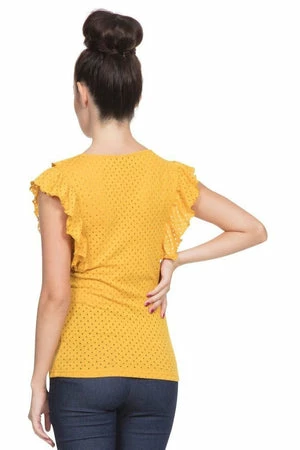 “Louis” a spectacular, yellow, knitted, vintage top from Voodoo Vixen. This retro top has a scooped neckline with tie, ruffles on the sleeves and collar, pleating on the chest to emphasise your figure and a cut-out polka dots style.