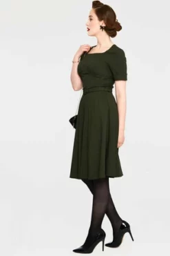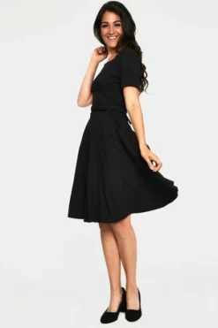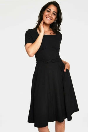 The midi dress has front bodice cross drape details, pockets, short sleeves, matching belt, a square neckline, a flattering fit and it fastens with a zipper at the back.