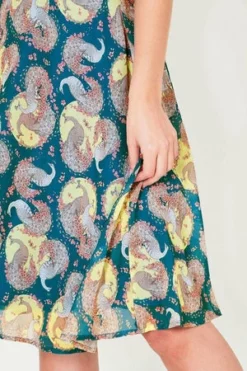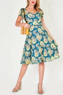 This midi dress has peacock print, a sweetheart neckline, frill short sleeves, a flared skirt, a flattering fit and it fastens with a zipper at the back.