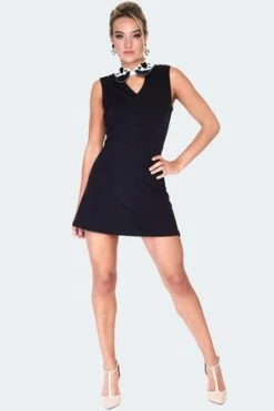 The A-Line dress has heart collar, a halter neckline, side pockets, button detailing and it fastens at the back with a zipper.