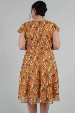 The A-Line dress has floral design, neck tie detailing, a round neckline, short sleeves and it fastens at the back with a zipper.