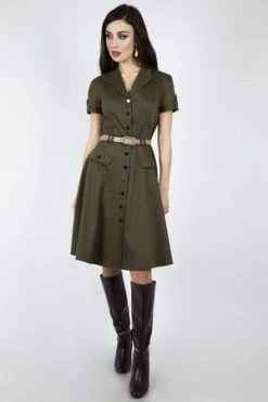 This knee length flared dress has a collared V-neckline, short sleeves, a contrast belt, jetted pockets, a flattering fit and it fastens with contrast buttons at the front.