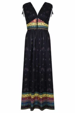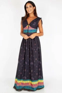 The maxi A-line dress has fiesta themed print, a V-neckline, shoulder tie detail, contrast border print, button detailing and a flattering fit.