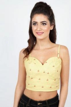 This cropped top has yellow and white stripes, a sweetheart neckline, cherry detailing, spaghetti straps and a flattering fit.