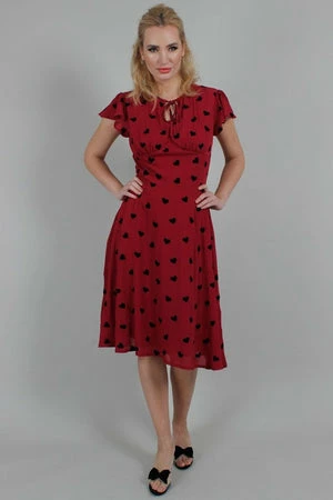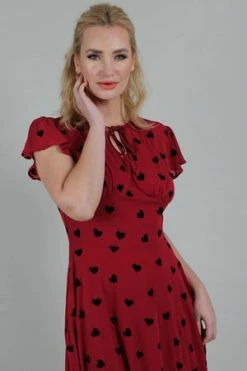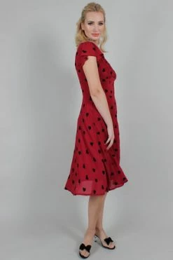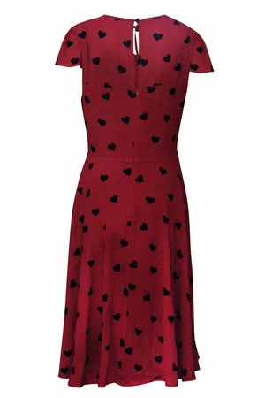 This smock midi dress has black velvet hearts print, a round neckline, short sleeves, a flattering fit and it fastens at the back with a hidden zipper.