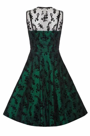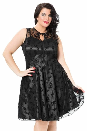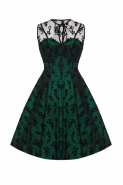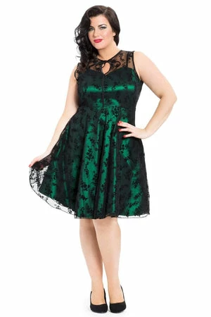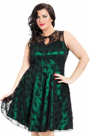A stunning plus size rockabilly dress from Voodoo Vixen called Penny, which is available in black or green colours. This design has a patterned lace overlay with a floral design and is completed with a sweetheart neckline and lace tie. The classic rockabilly style cut will flatter any bodyshape, it is gathered at the waist and flares out below,