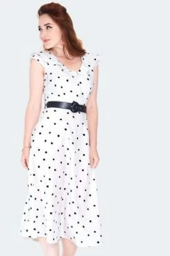 The 40s style midi dress has polka dots design, wide ruffled collar, contrast belt detail, V-neckline, pockets, a flattering fit and it fastens with buttons at the front.