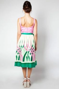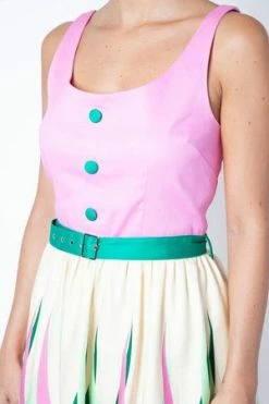 This midi dress has an abstract print, a scoop neckline, contrast fabric coated buttons, belted waist and it fastens at the back with a hidden zipper.