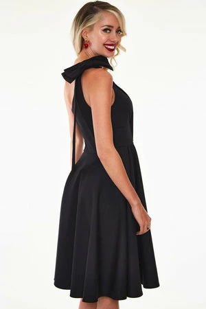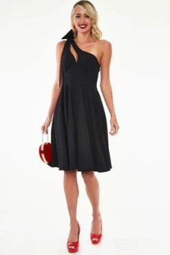 The skater dress has one shoulder strap detailing, oversized bow detail, fitted waist,