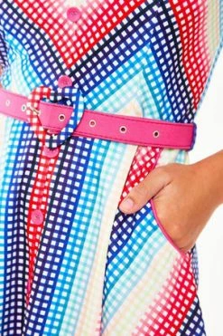 The A-line flared midi dress has gingham multicolor print, a sweetheart neckline, belt and button detailing, pockets, a flattering fit and it fastens with a zipper at the back.