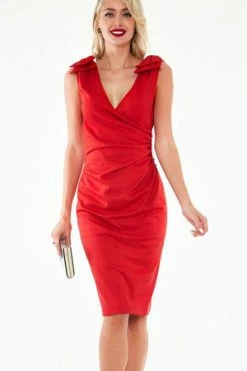 The midi skater dress has bold shoulder bow detail, a V-neckline and a flattering bodycon silhouette.
