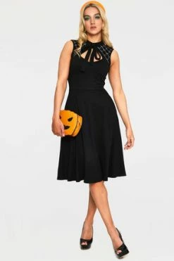 This swing dress has spider web embroidery, sweetheart bust detail, tie neck detail, a flattering fit and it fastens with a zipper at the back.