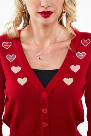 The knitted cardigan has front and back heart motifs detail, a V-neckline, three quarter length sleeves, rib hem and cuffs and it fastens at the front with glossy heart shaped buttons.