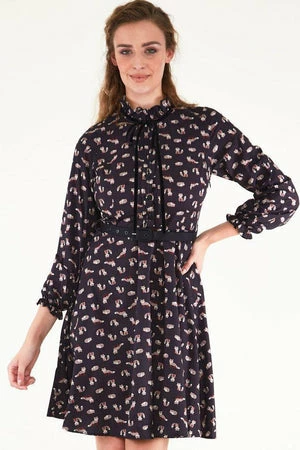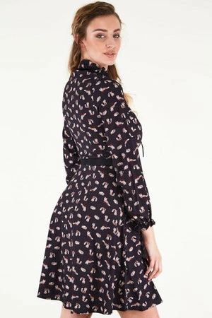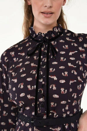 This mini dress has fox print, a high neckline, bow neck detailing and a flattering fit.