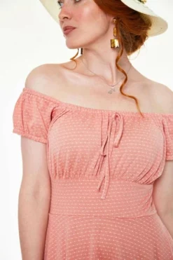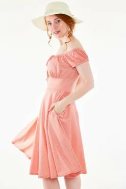 The midi off the shoulder flared dress has polka dot print, gathered detailing, pockets, short sleeves, round neckline and a flattering fit.