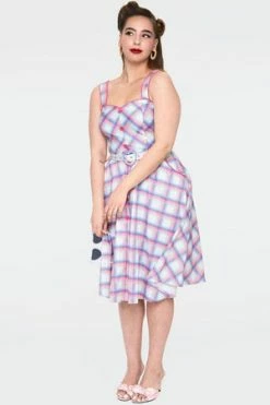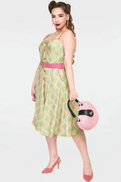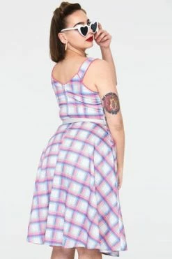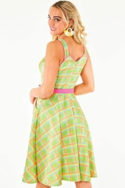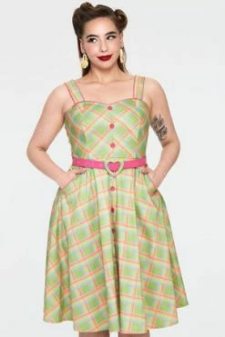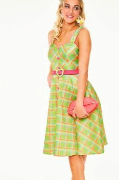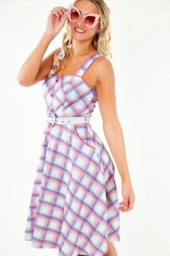 The vintage dress has bright rainbow tartan print, heart shaped belt and bright buttons detailing, sweetheart neckline and it fastens at the back with a button.
