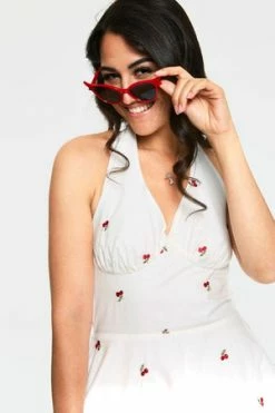 The halterneck midi dress has juicy cherries embroidery, a V-neckline, belt and button detailing, pockets, a flattering fit and it fastens with a zipper at the back.