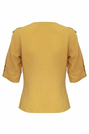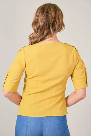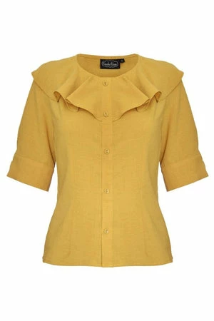 This top has frill detailing, short sleeves, a crew neckline , a flattering fit and it fastens with buttons at the front.